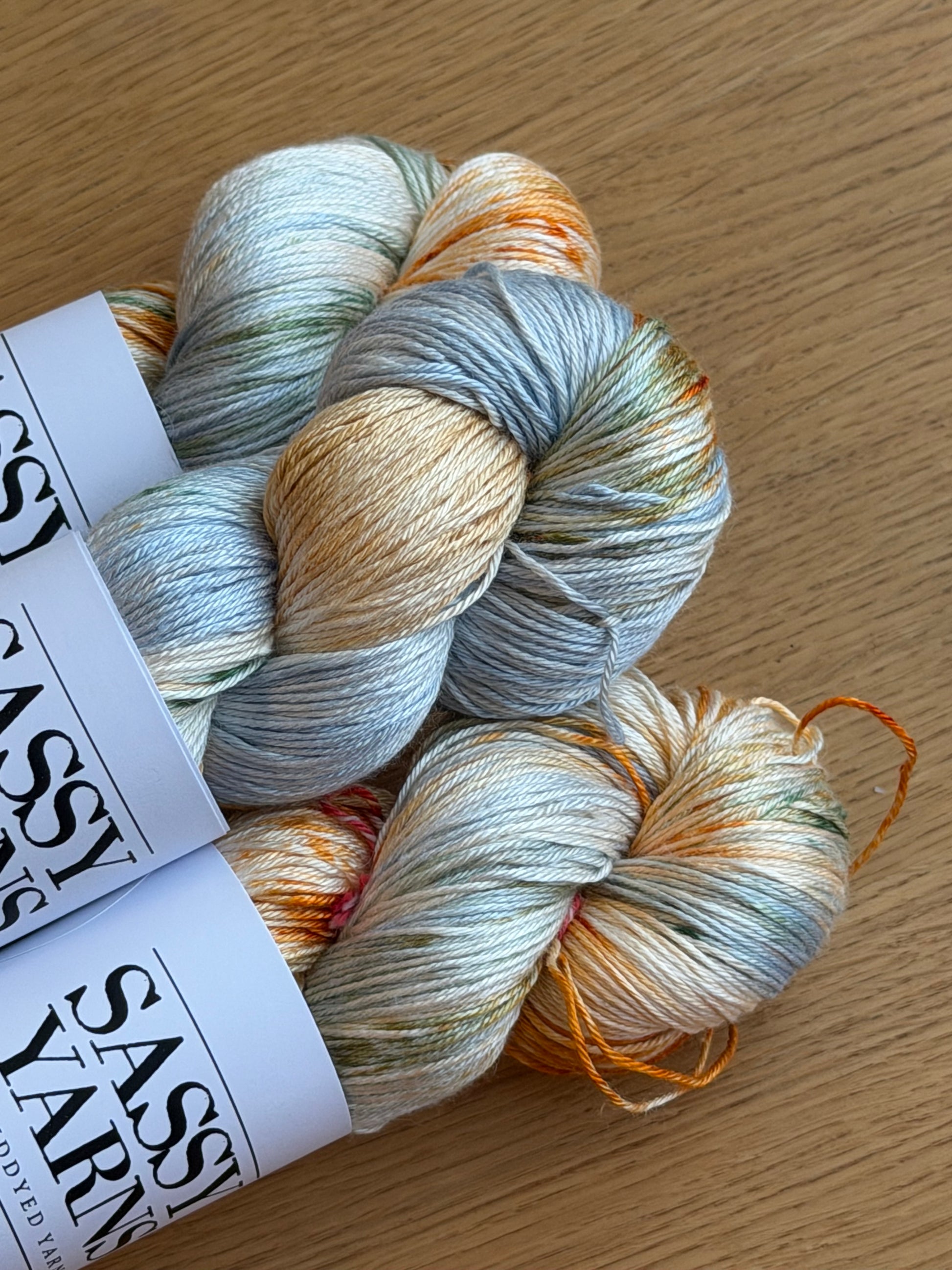 Håndfarvet garn er farvet i små partier og billedet er repræsentative for farvning. Dog er det ikke nødvendigvis det fed du modtager. Ved projekter hvor flere fed er involveret, anbefales det at skifte mellem forskellige fed for at undgå at farver ”grupperer sig”.