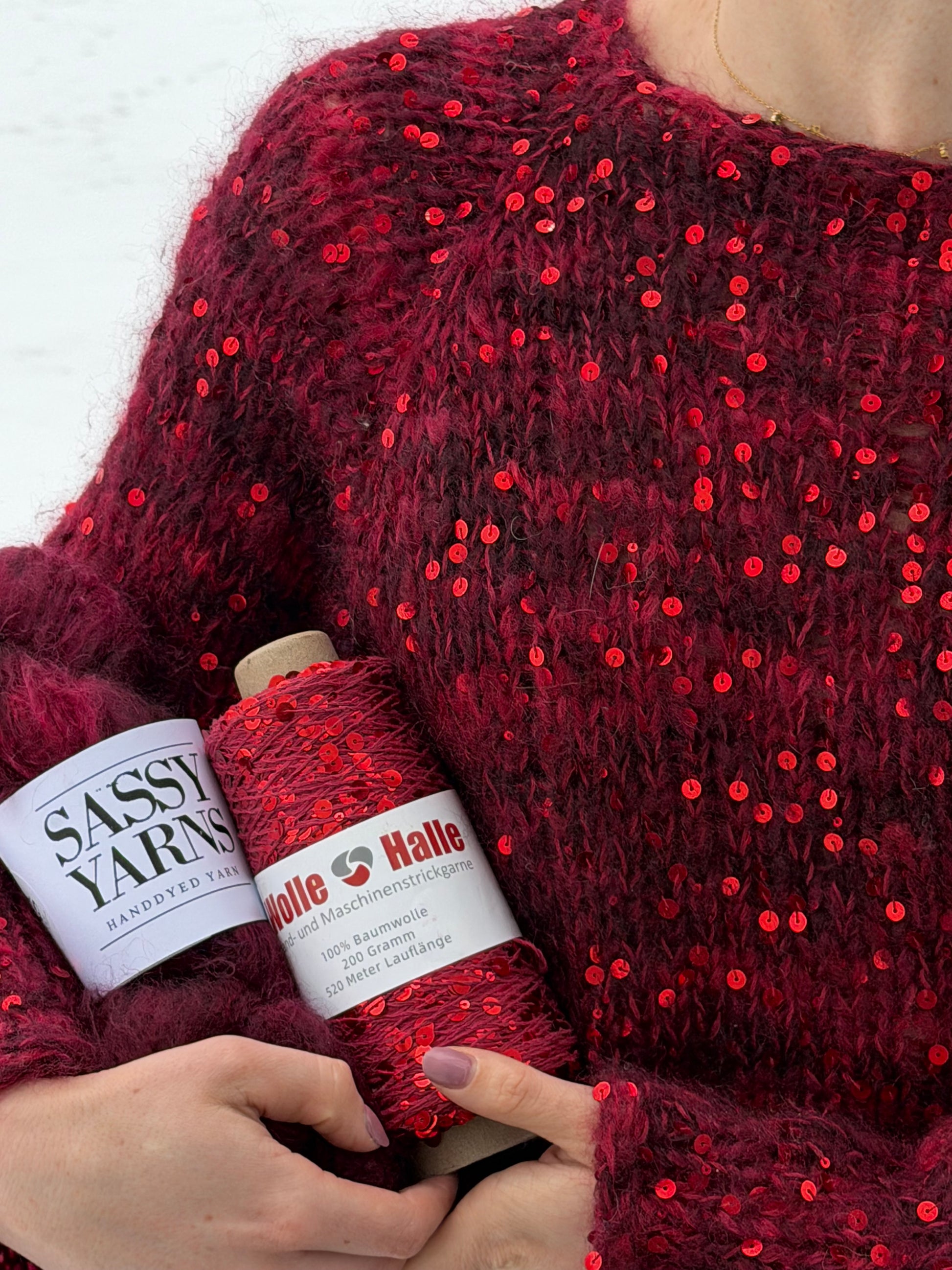 • Pailletgarn (100 % bomuld samt pailletter) fra Wolle und Halle, 520 m/200 g,