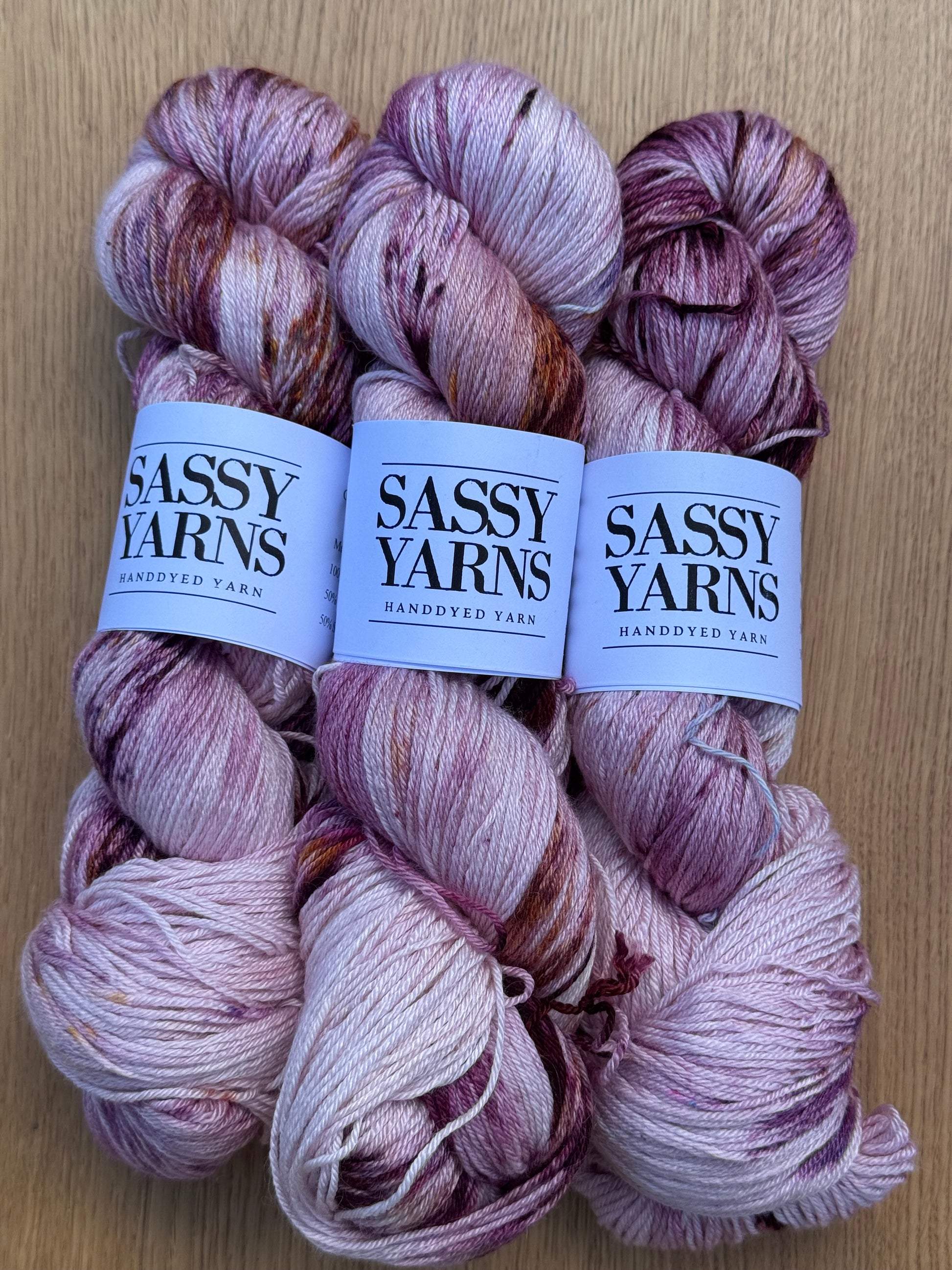 Håndfarvet garn er farvet i små partier og billedet er repræsentative for farvning. Dog er det ikke nødvendigvis det fed du modtager. Ved projekter hvor flere fed er involveret, anbefales det at skifte mellem forskellige fed for at undgå at farver ”grupperer sig”.
