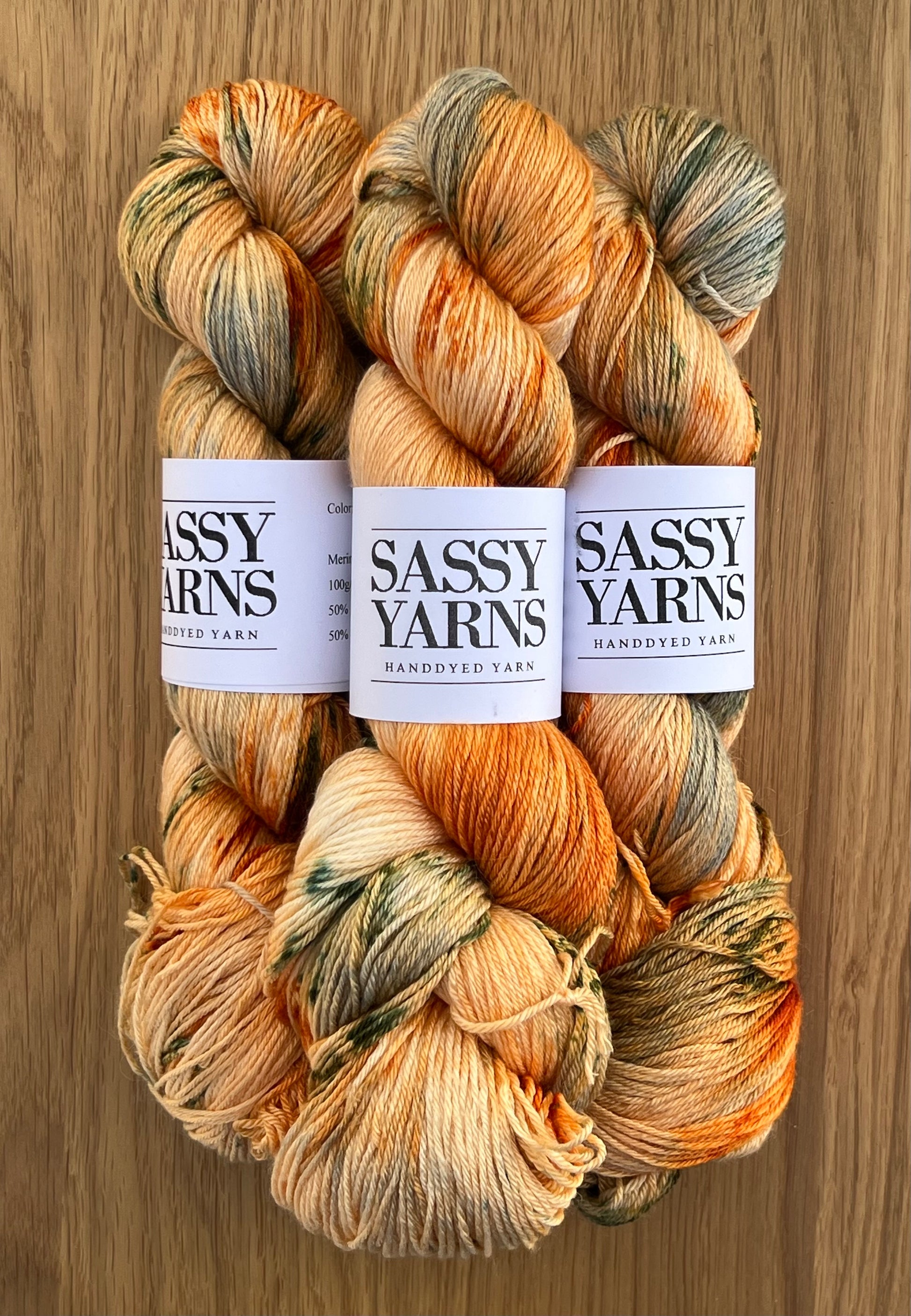 Håndfarvet garn er farvet i små partier og billedet er repræsentative for farvning. Dog er det ikke nødvendigvis det fed du modtager. Ved projekter hvor flere fed er involveret, anbefales det at skifte mellem forskellige fed for at undgå at farver ”grupperer sig”.