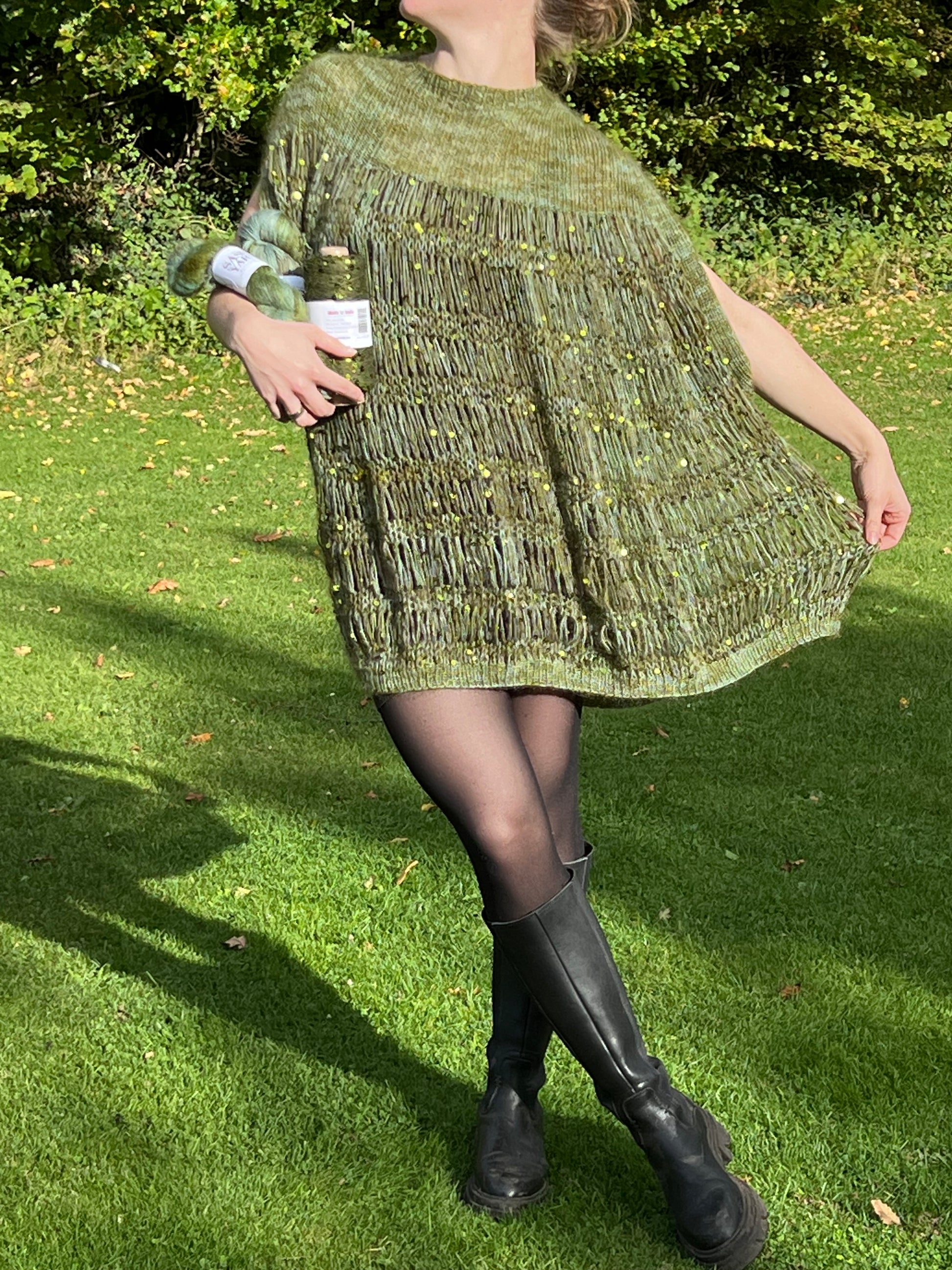 Vores version er stikket i en tråd Kid silk mohair 420m/50gr holdt sammen med en tråd Merino Lace 800m/100gr. Også i en paillettetråd fra Wolle Halle.