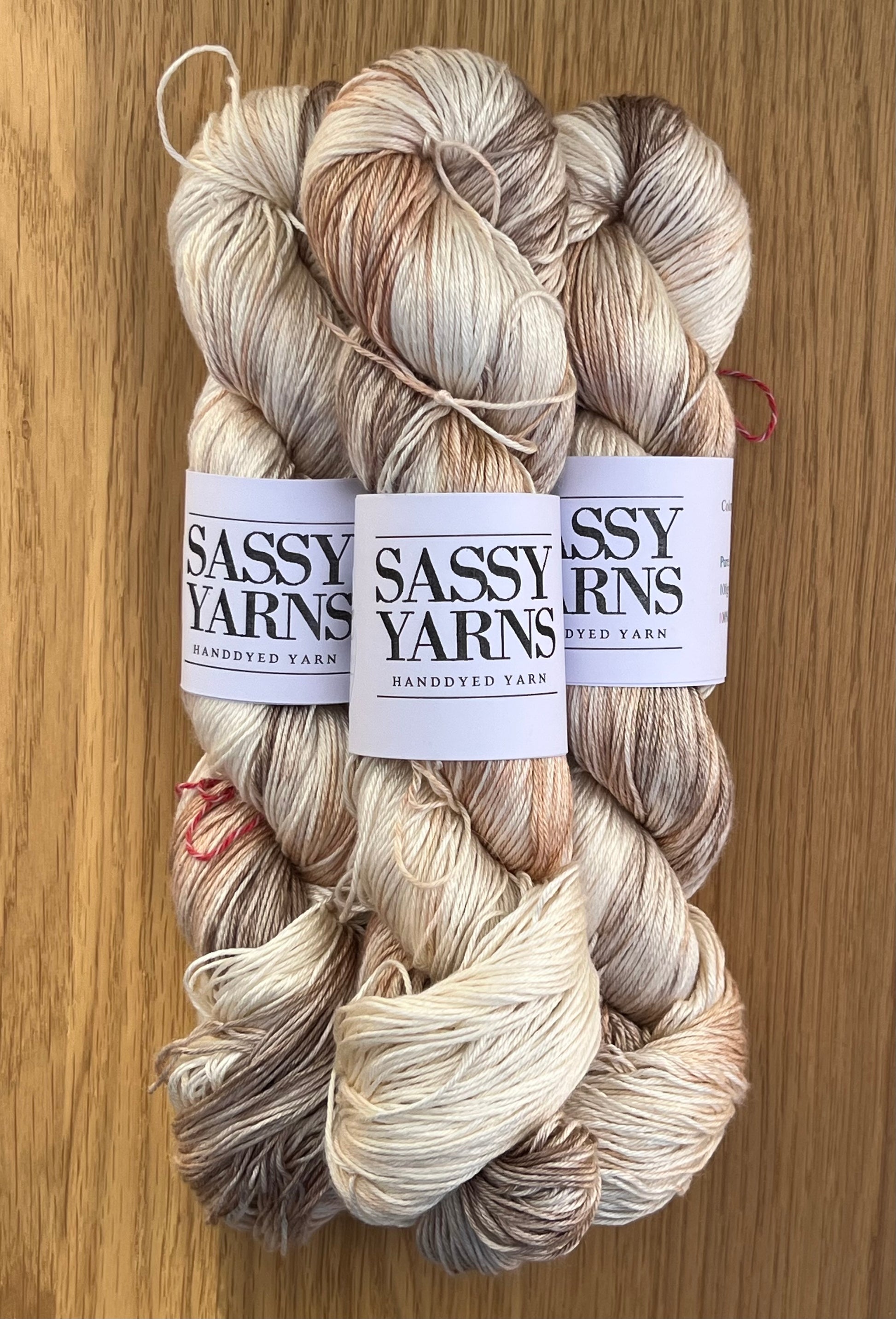 Håndfarvet garn er farvet i små partier og billedet er repræsentative for farvning. Dog er det ikke nødvendigvis det fed du modtager. Ved projekter hvor flere fed er involveret, anbefales det at skifte mellem forskellige fed for at undgå at farver ”grupperer sig”.