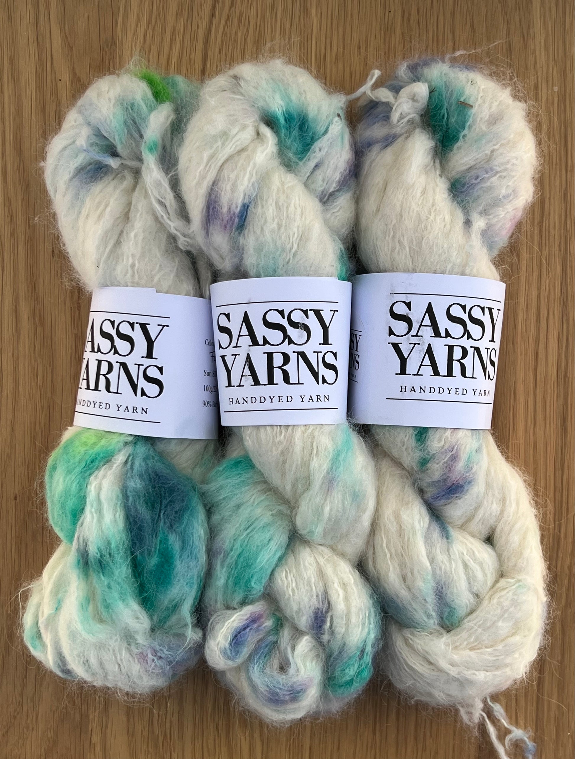 Håndfarvet garn er farvet i små partier og billedet er repræsentative for farvning. Dog er det ikke nødvendigvis det fed du modtager. Ved projekter hvor flere fed er involveret, anbefales det at skifte mellem forskellige fed for at undgå at farver ”grupperer sig”.